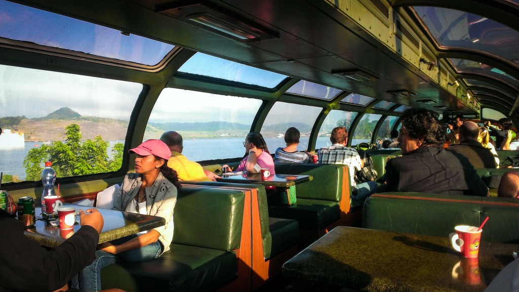 El tren parte de la estación a las 7:15 de la mañana. Y es una muy buena manera de empezar el día, un relajante viaje en tren, admirando una de las mayores obras civiles de la humanidad, a bordo de un mítico tren: para mí, es la perfecta manera de empezar un viaje que combina selva, playa y montaña. Vamos de un océano a otro en un recorrido maravilloso con vistas del Canal y la selva tropical de los alrededores; una atractiva combinación de la jungla verde con las enormes máquinas en plena actividad y dinamismo del canal. El paisaje es espectacular. Además, nos sirve para llegar al destino, de una forma mas espectacular, aunque todo hay que decirlo, resulta bastante caro para lo que es.